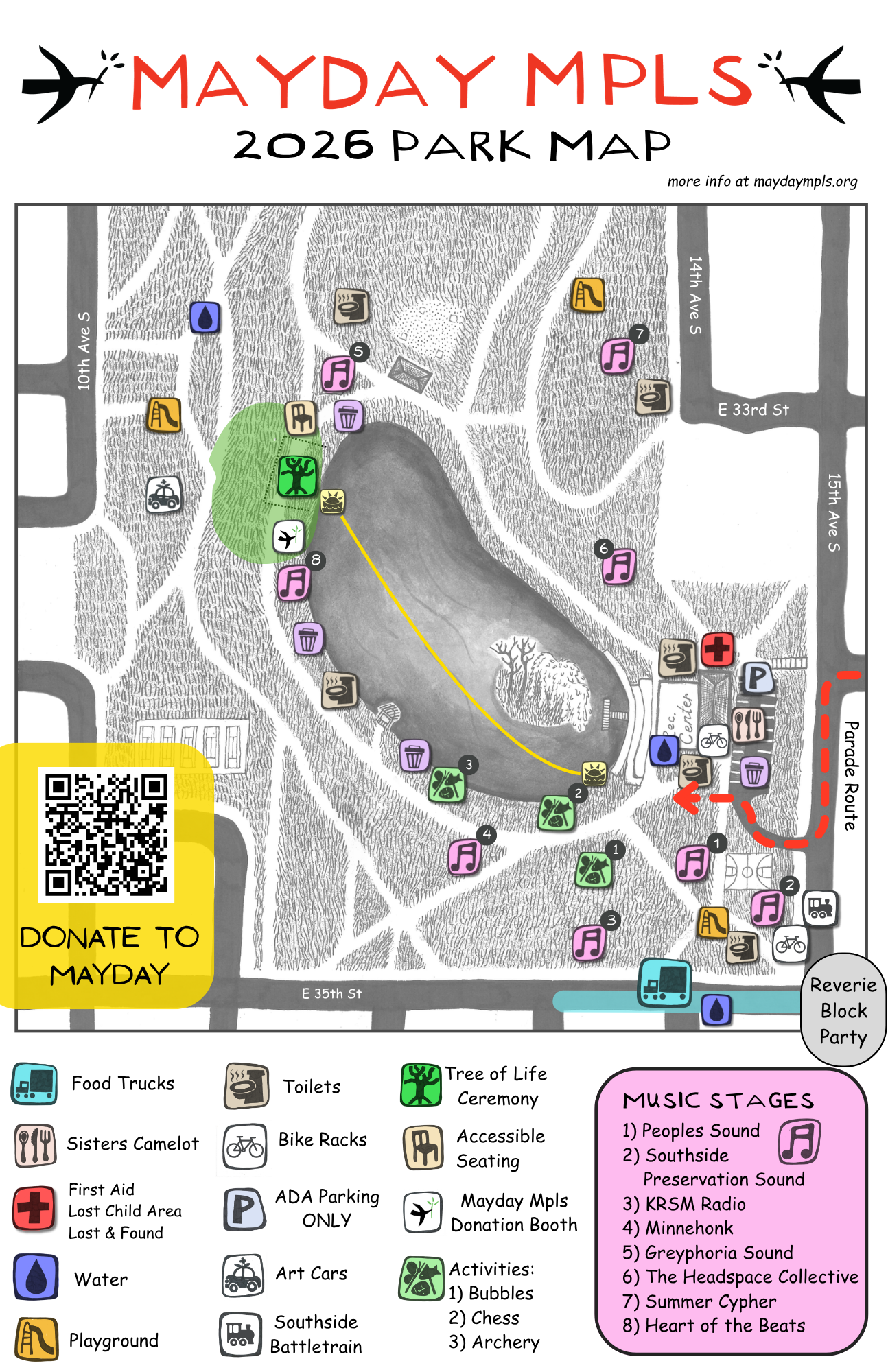 The Mayday Parade follows Bloomington Avenue from 28th St. to Powderhorn Park (see route map here). There is no public parking in the Powderhorn Park lot during Mayday, and the limited parking there is reserved for Disability Parking only.